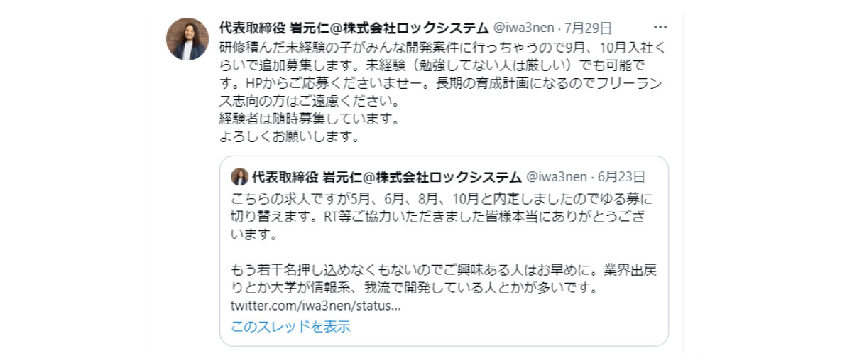 そこでつぶやいておりましたがロックシステムでは毎月未経験の採用をしてます。