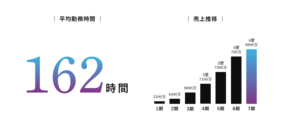 まずは「月平均勤務時間」と「売上推移」をご紹介!こちらの数字はよく公開してますね。月平均勤務時間は162時間!20日働いてだいたい1日、8時間程メンバーみんな無駄な残業せず定時内に仕事を終わらせて優秀ですね~。
