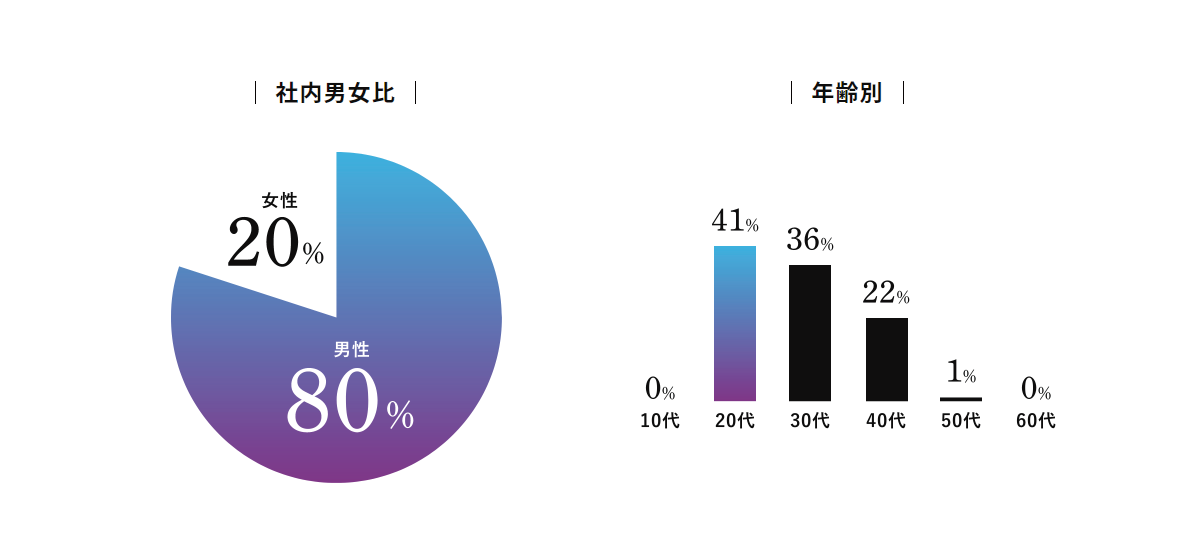 続いては「社内男女比」と「年齢別」若手、中堅どこの多いロックシステム20代、30代が全体の77%と多いですね。世代が近いからこそ社内に上下関係があまりないので、困ったことがあってもすぐに相談することができたり、コミュニケーションが取りやすいというのも強みの一つとも言っておきましょう。