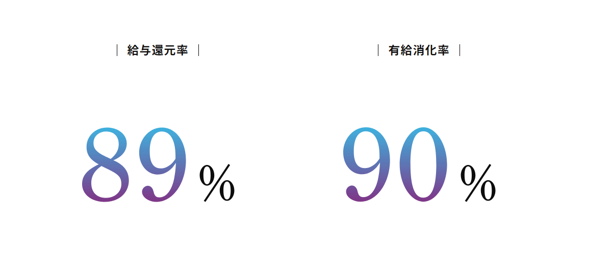 89%、90%と高い数字が並ぶ給与還元率と有給消化率、休みが取りやすいのはいいことですが消化率は100%にしていきたいですねー。自分も有給取って旅行でも行こうかな。