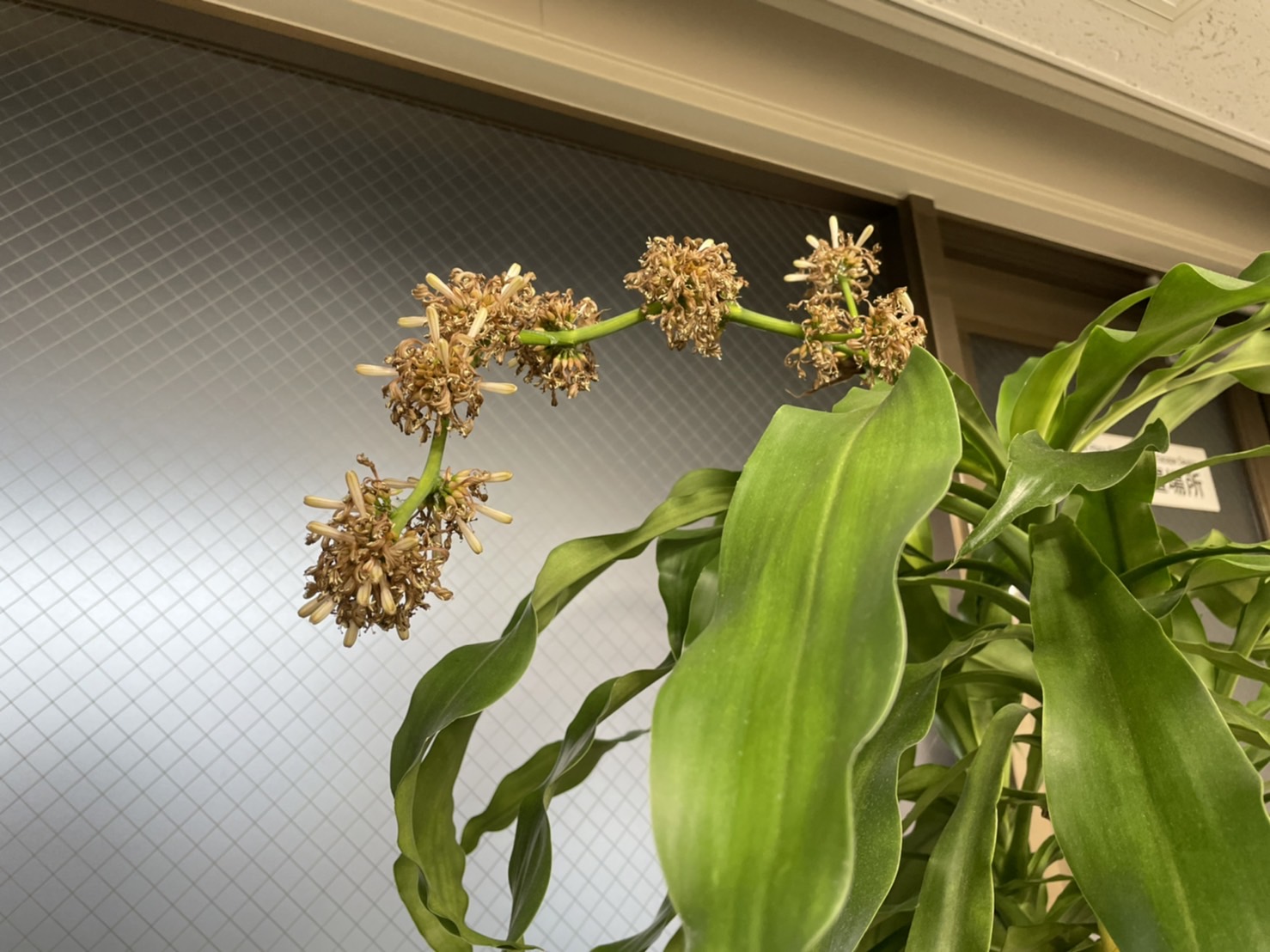 最近、事務所のエントランスに置いている観葉植物から花が咲きました。