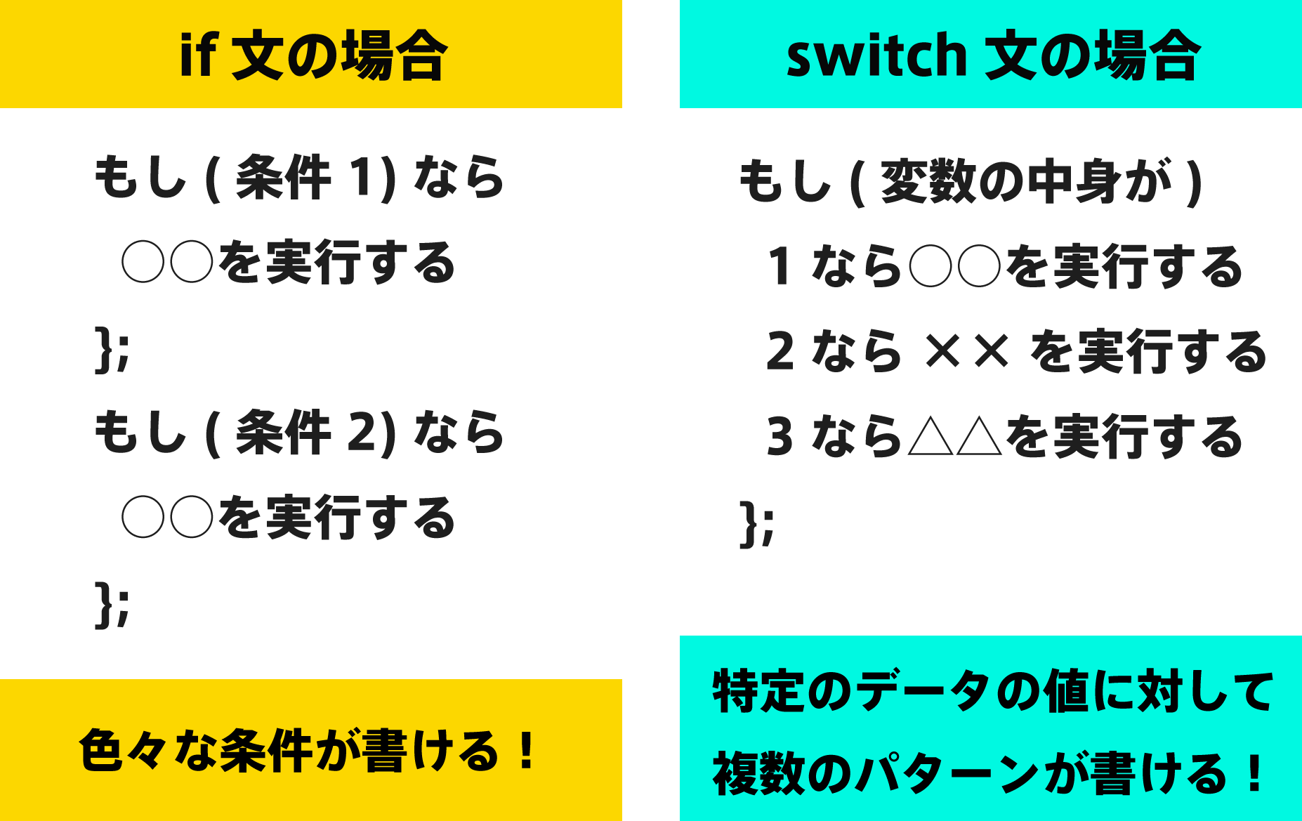 if文はどんな条件分岐でも書くことができますが、switch文で書いた方がコードが簡潔になる場合もあるので用途で使い分けましょう!