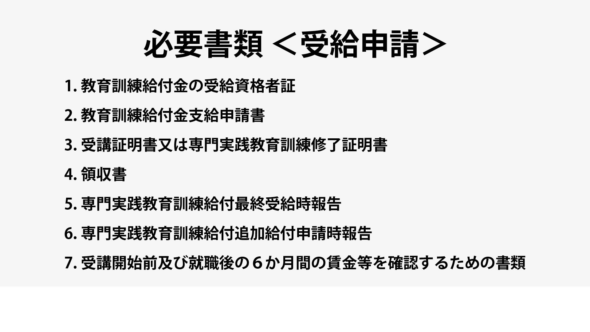 給付金を受給するには別途申請が必要となります。 受講修了後に以下の書類をハローワークに提出しましょう。