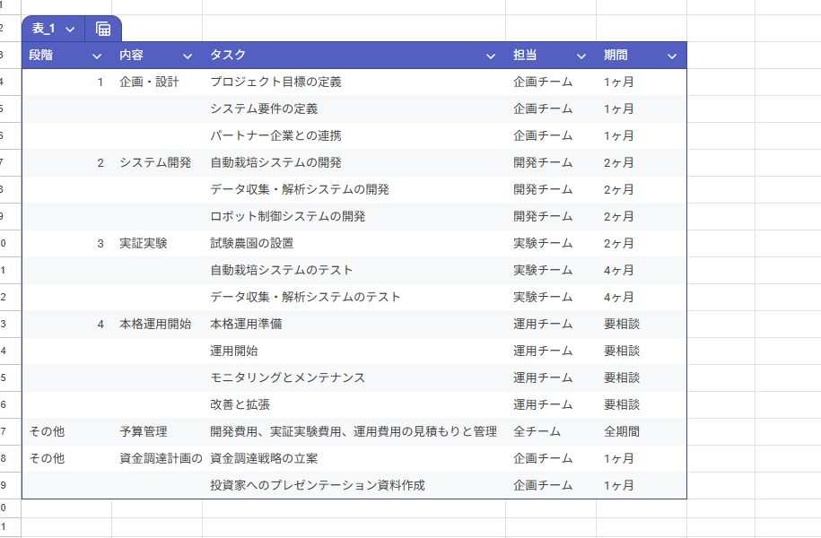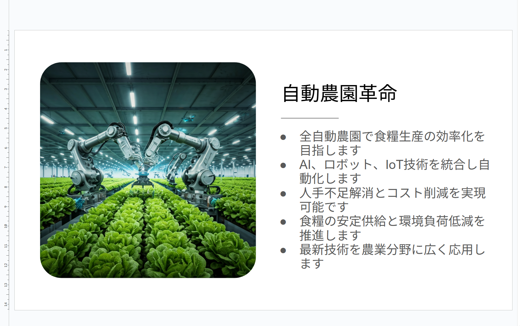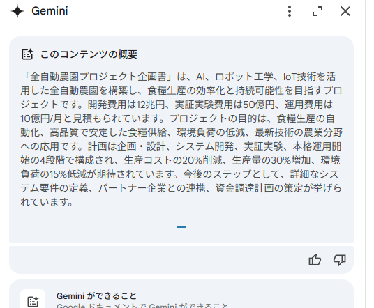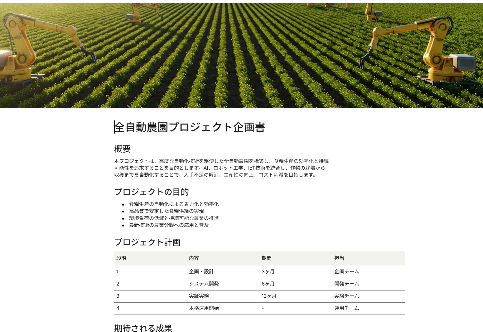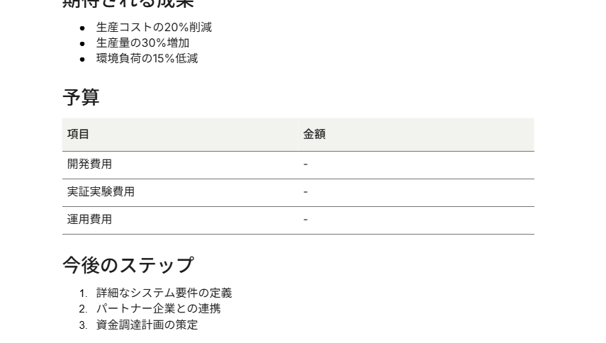 「全自動農園のプロジェクト企画書」というプロンプトで、ここまで成形したドキュメントを作成してくれるのは凄いですね。