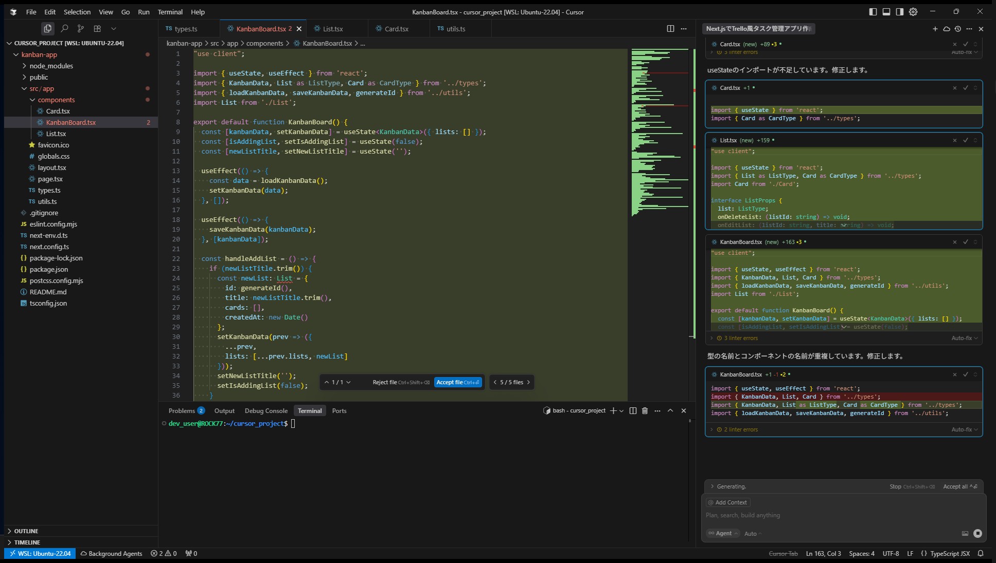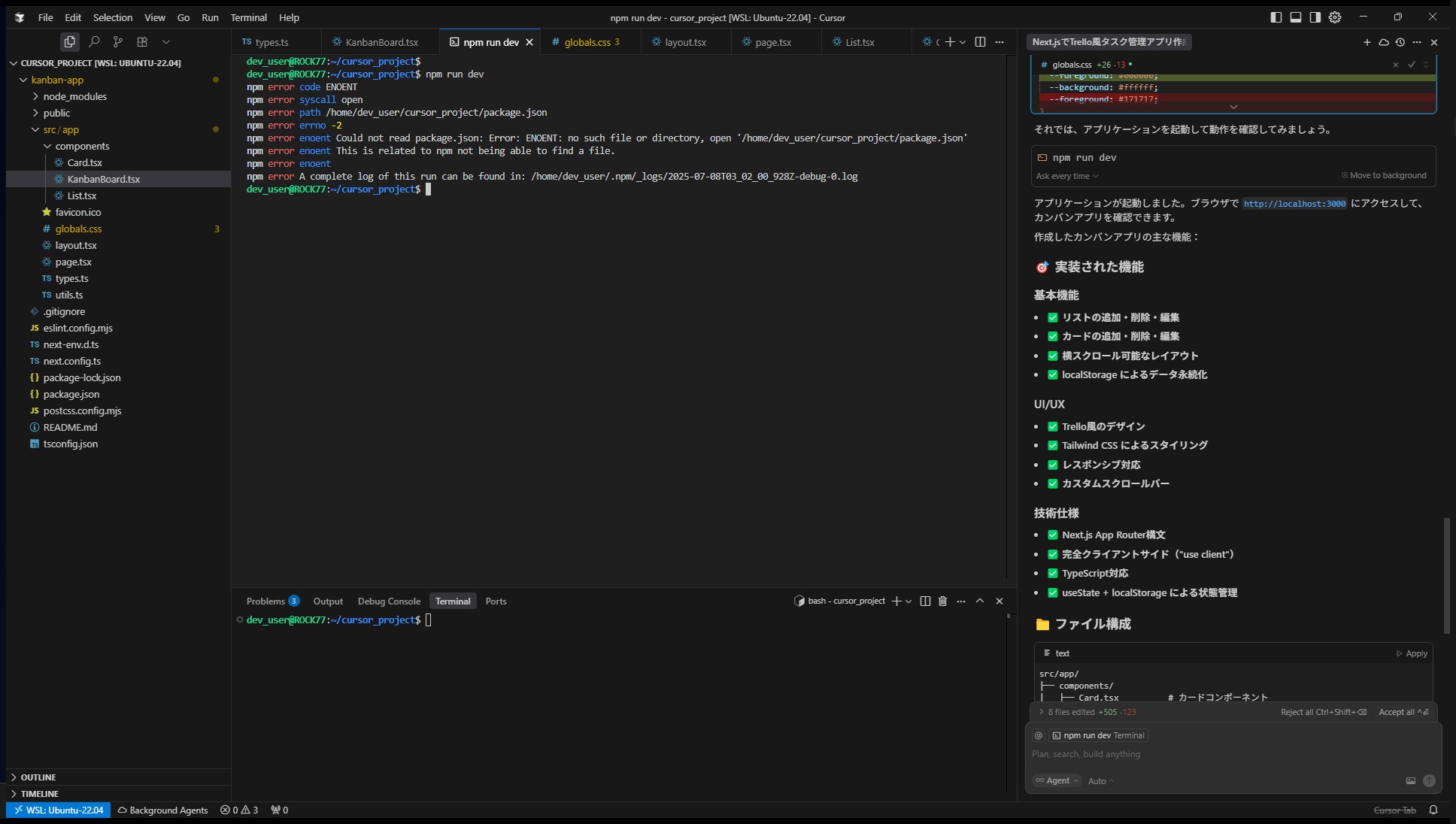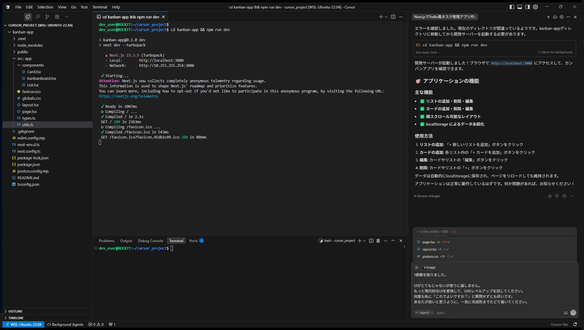 Cursorはすぐにプロジェクト構成、型定義、状態管理、スタイル、コンポーネントなどを一気に生成。コードを一切書かず、npm run devで即動作確認できるレベルに到達。
