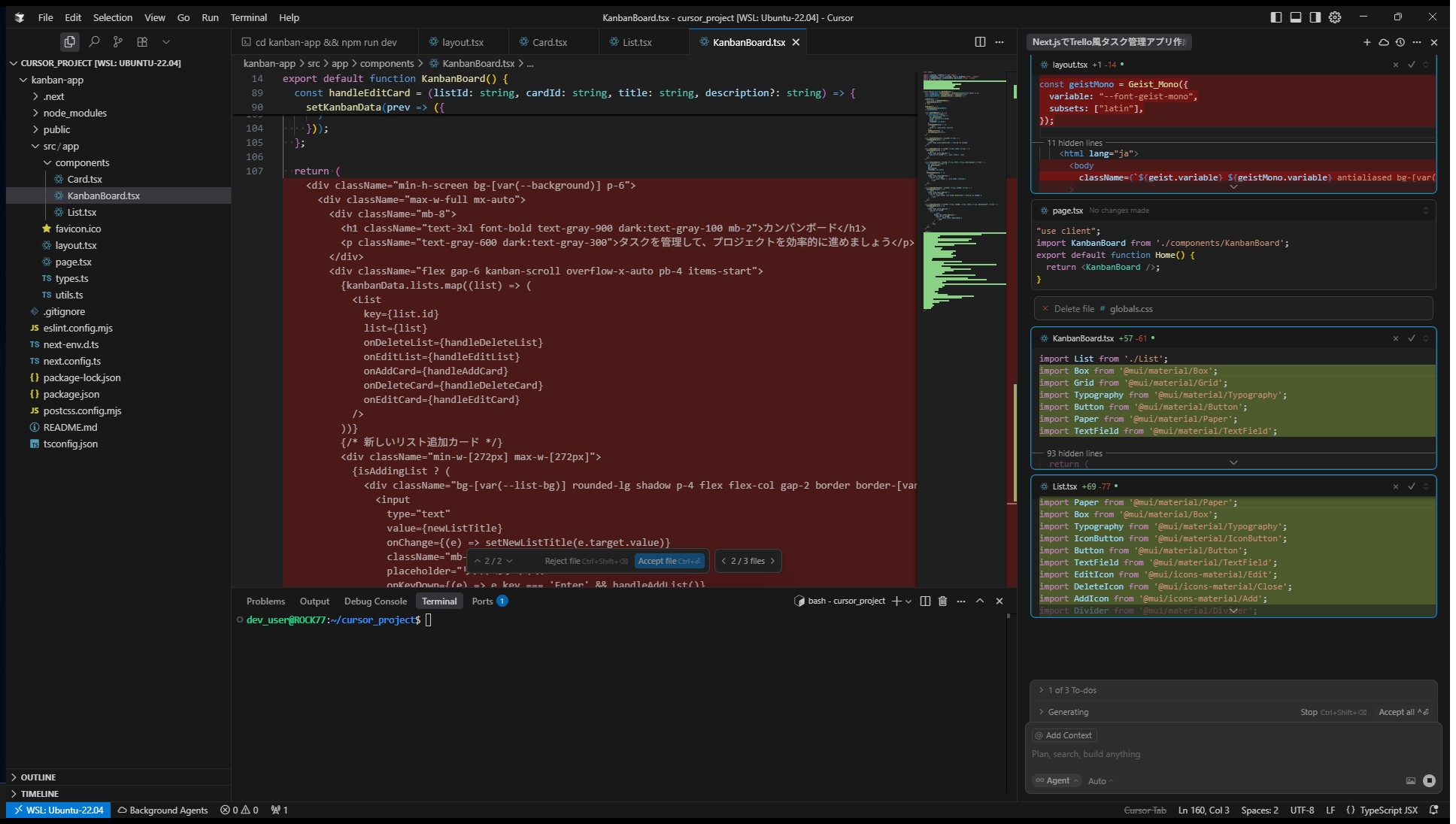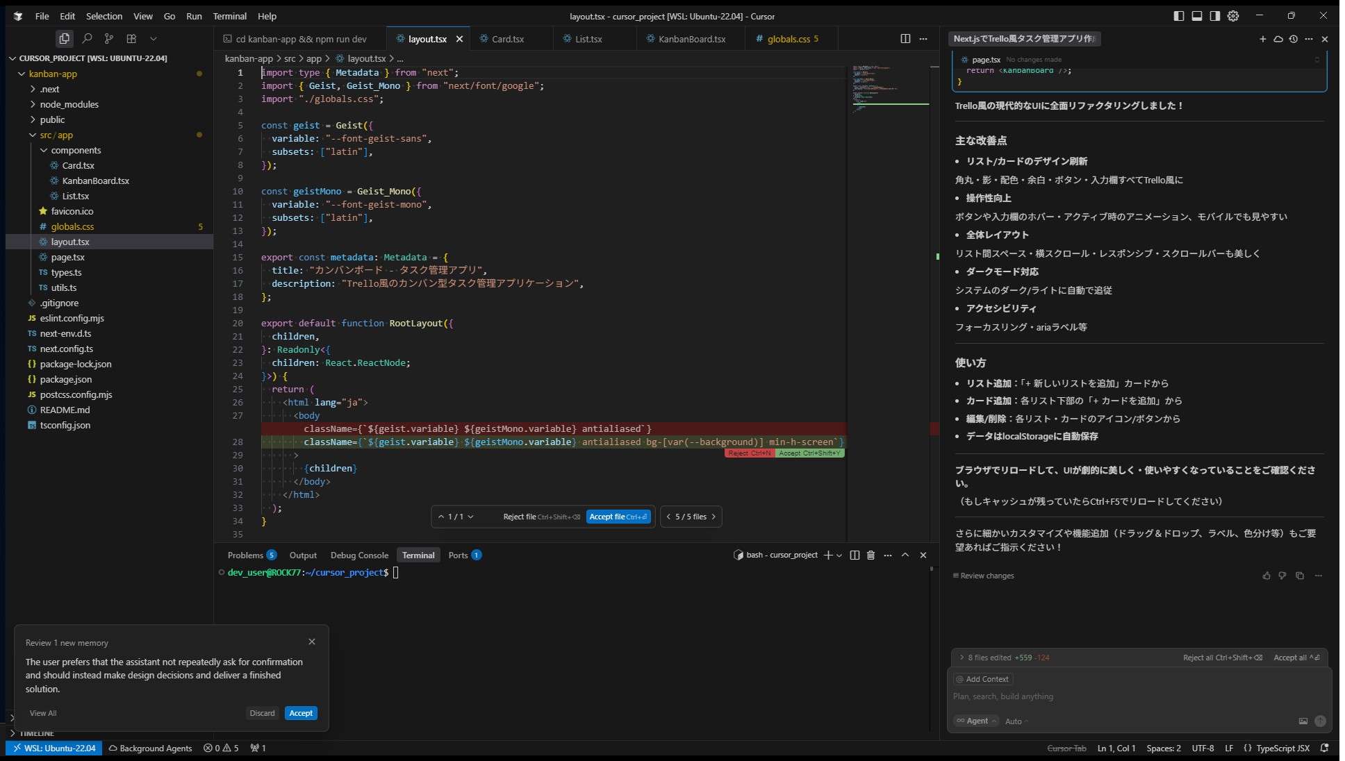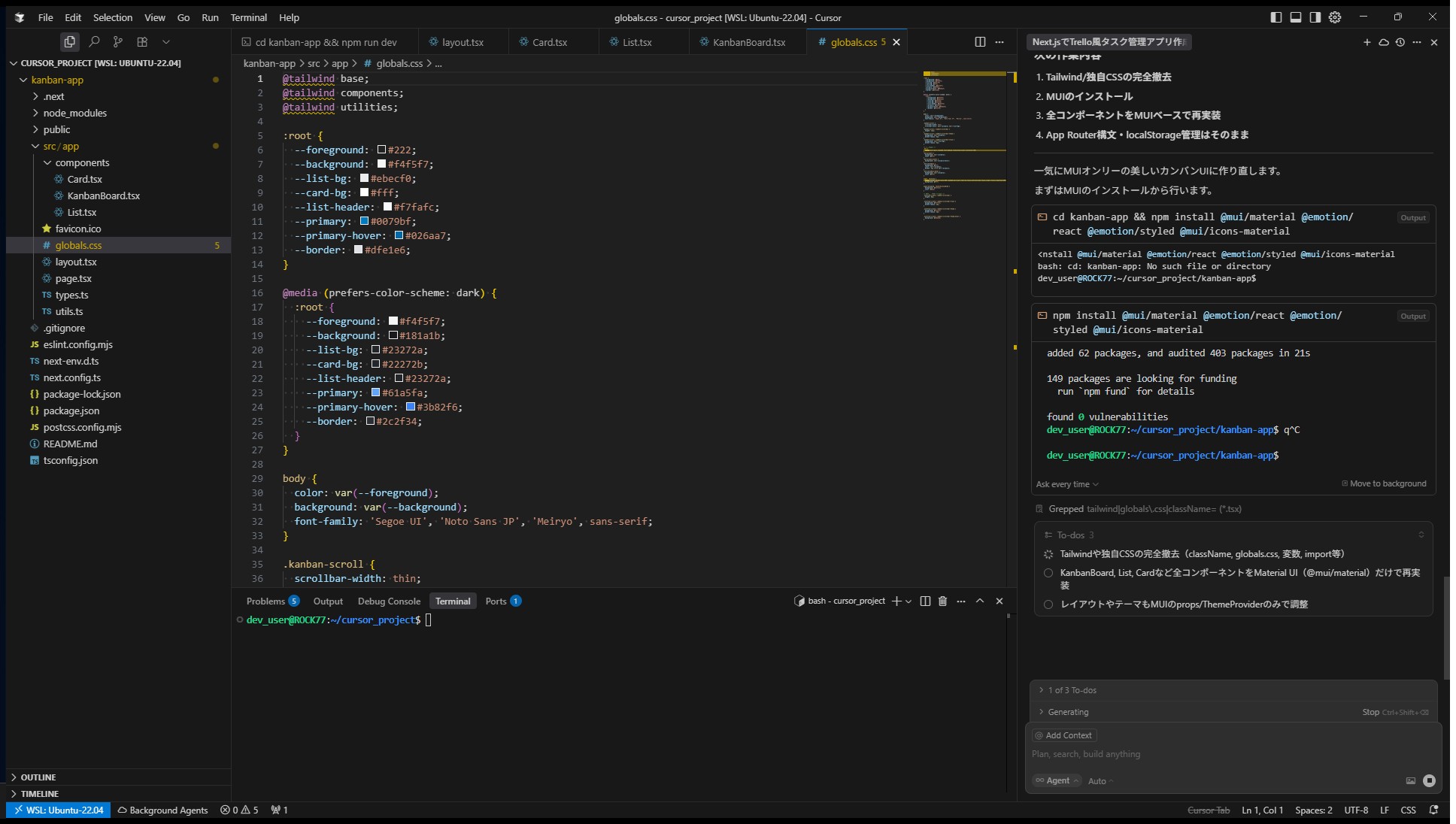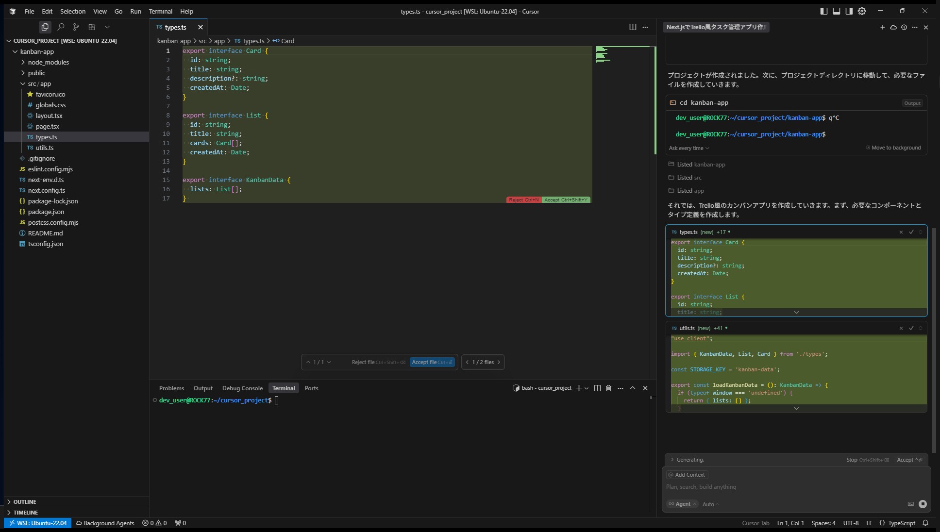 Cursorはすぐにプロジェクト構成、型定義、状態管理、スタイル、コンポーネントなどを一気に生成。コードを一切書かず、npm run devで即動作確認できるレベルに到達。