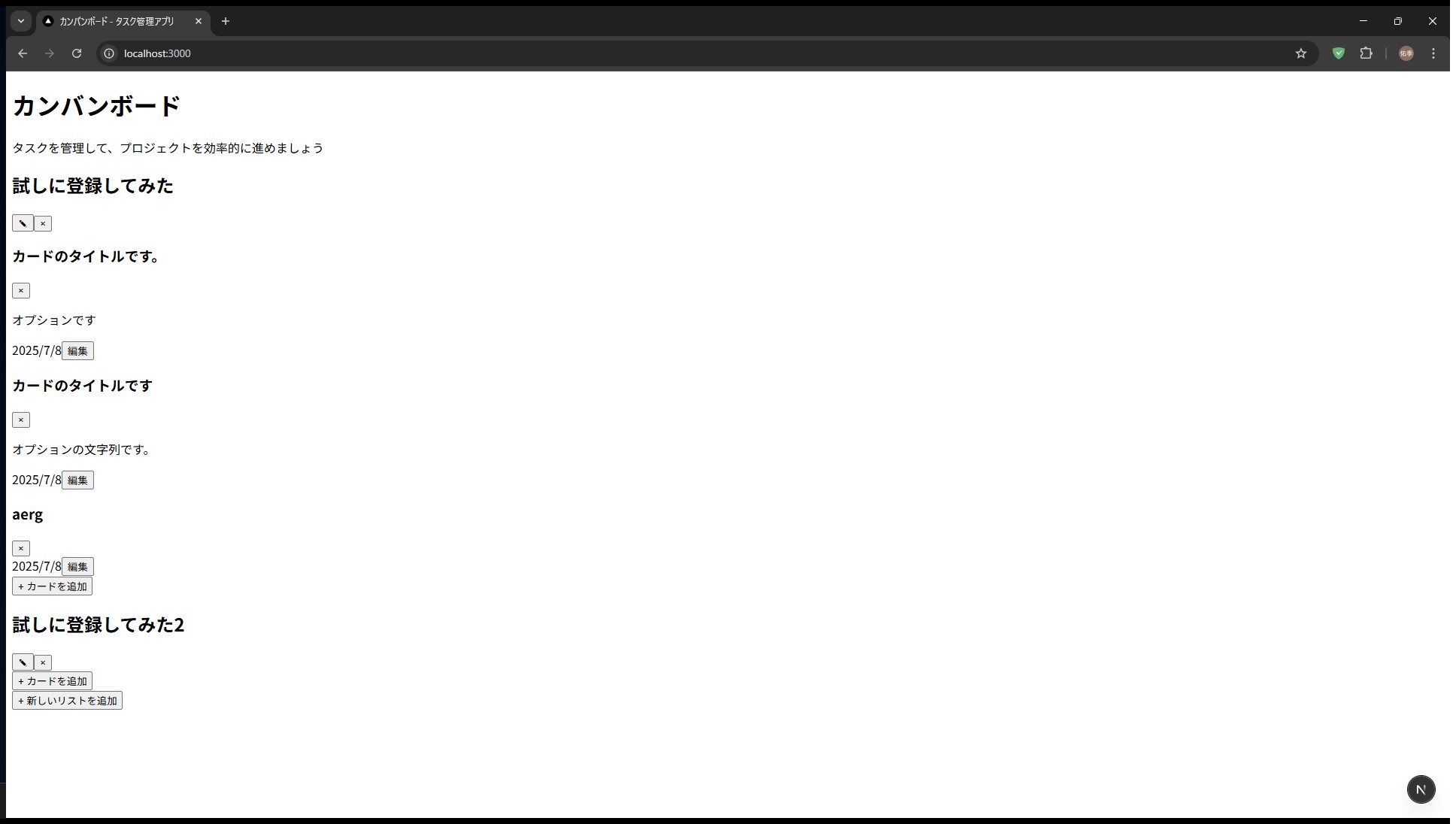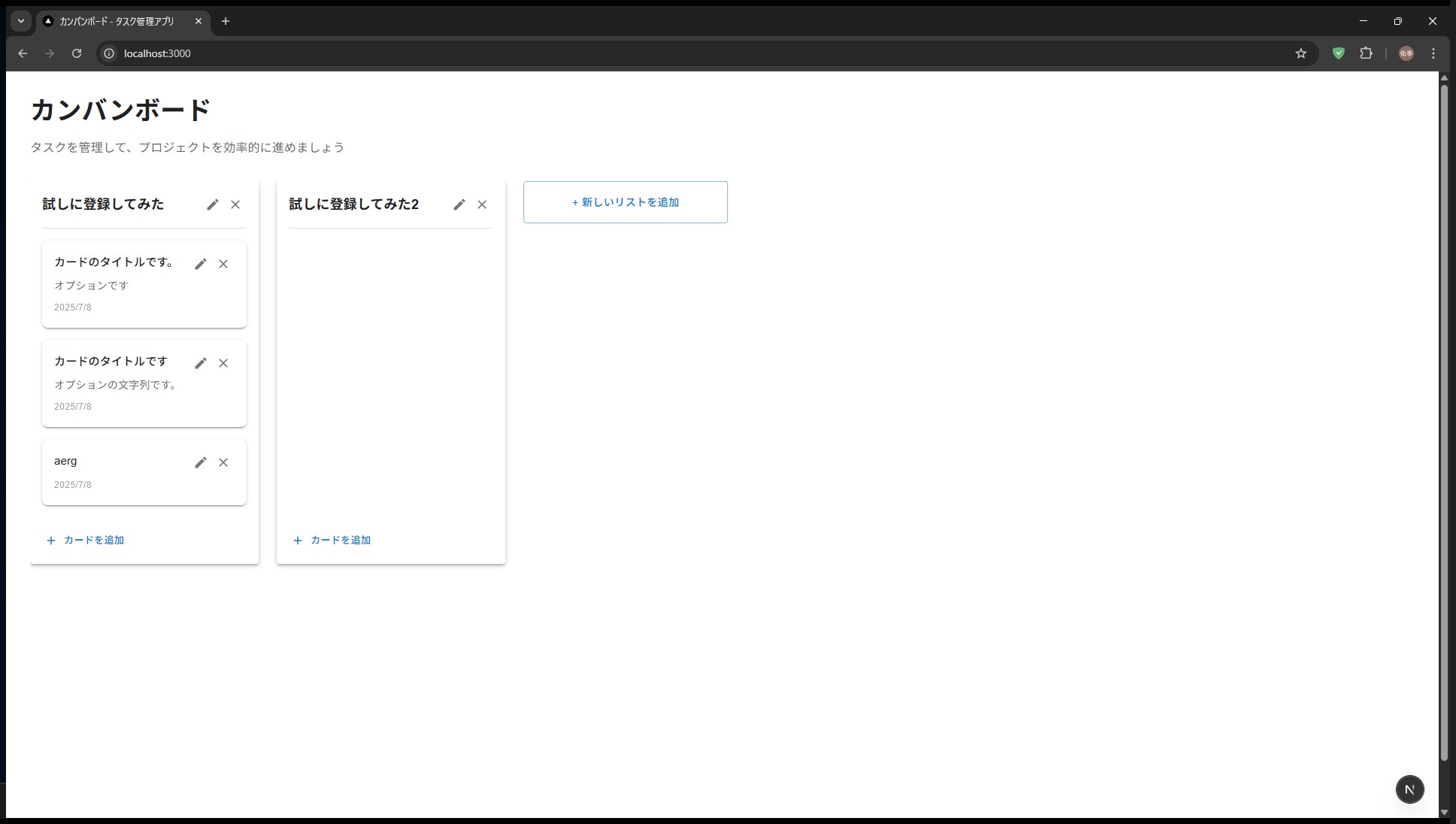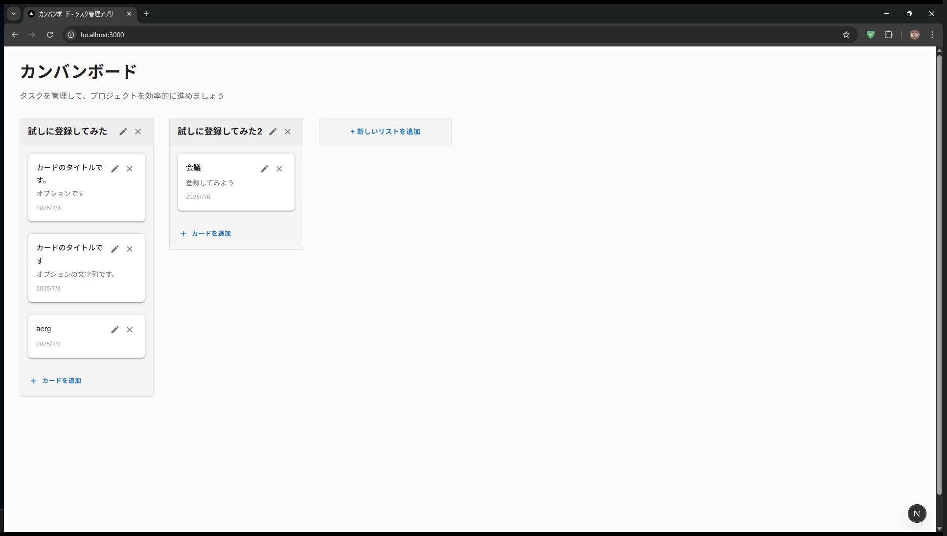 「Next.js(App Router構文)とReactで、Trello風のカンバン型タスク管理アプリを作って」 「完全クライアント、状態はuseState+localStorage、UIはTailwind」