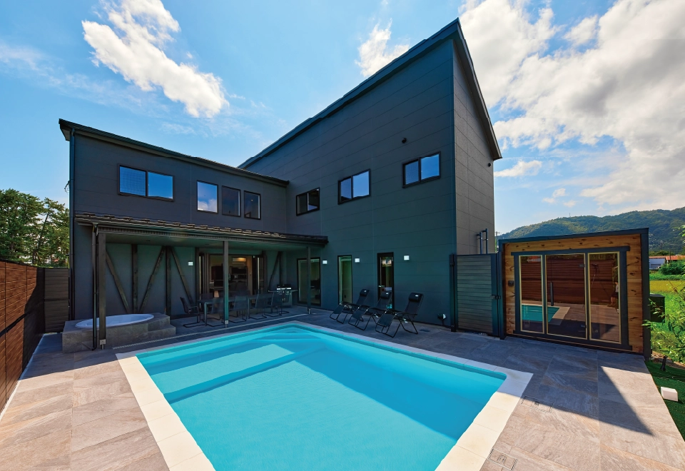 最大17名で過ごせる1日1組限定のプライベートヴィラで、サウナにプール付き。友人同士でも複数家族でも、のびのびと過ごせます。